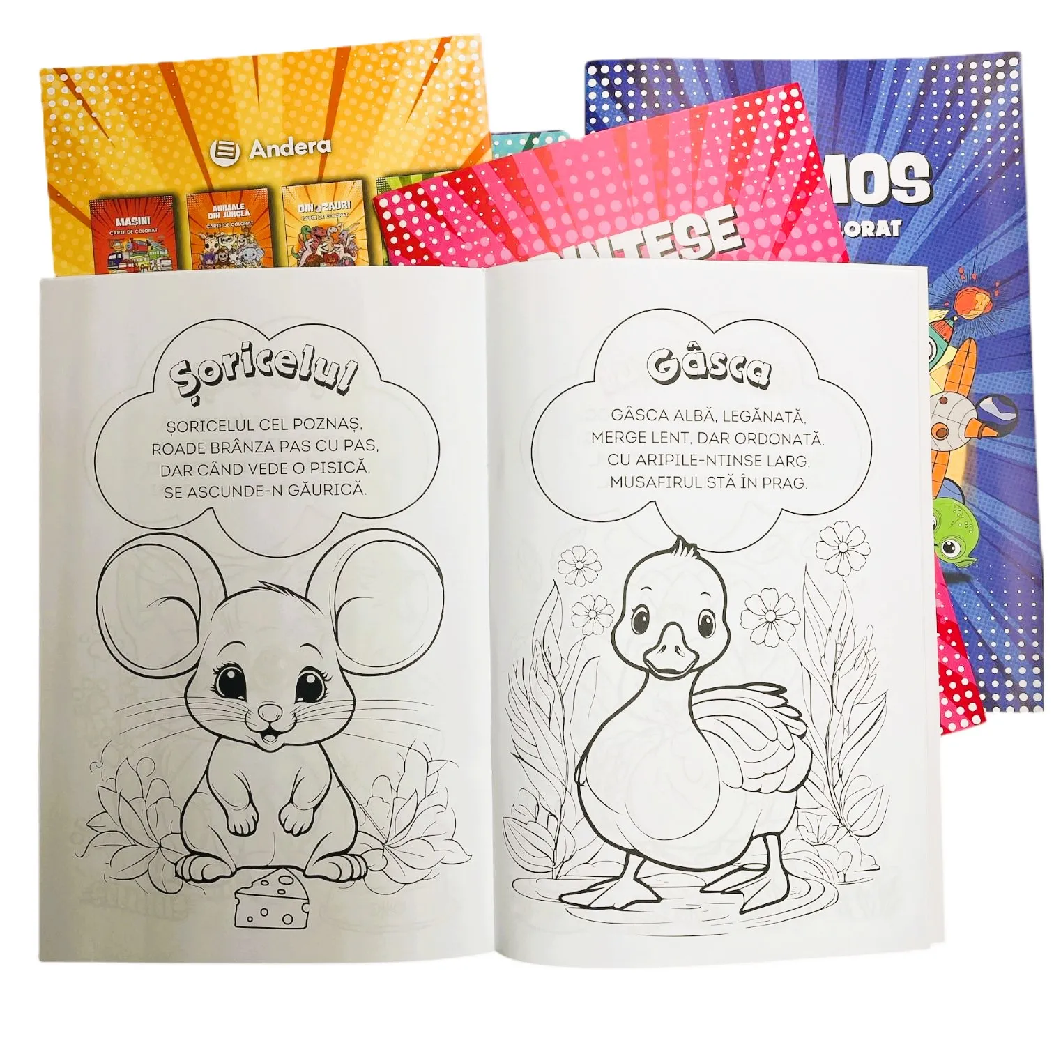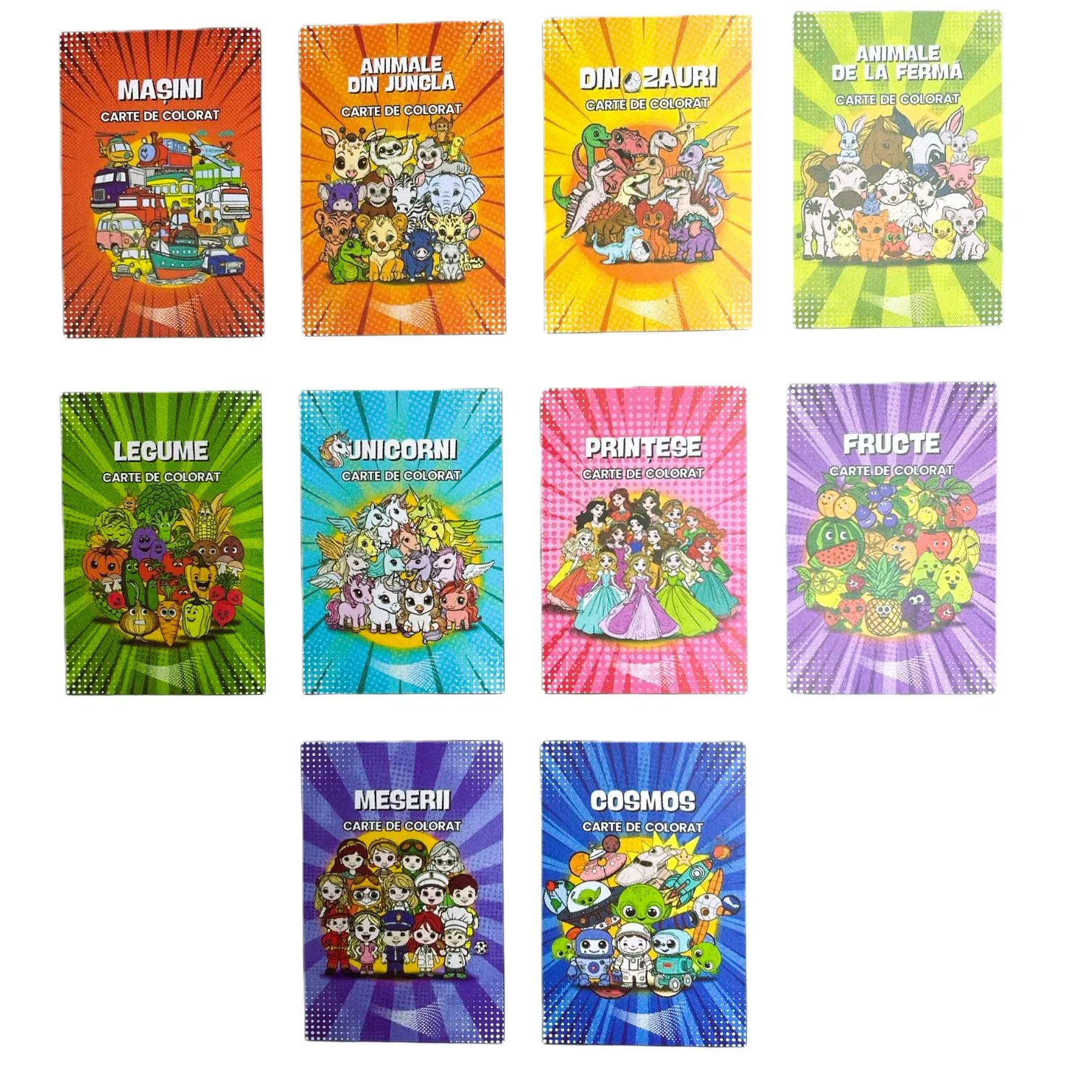 - Colectia cuprinde 10 carti: Masini, Animale din jungla, Dinozauri,Animale de la ferma, Legume, Unicorni, Printese, Fructe, Meserii si Cosmos
