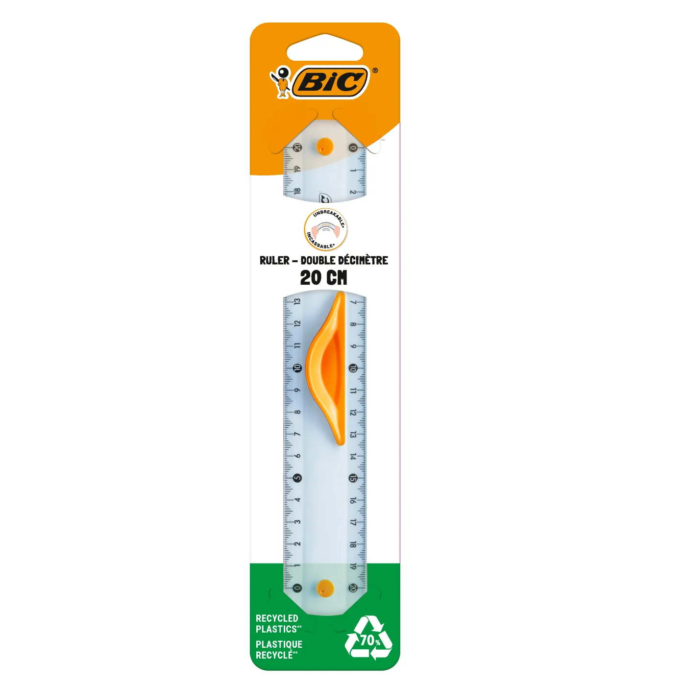 Această riglă de 20 cm, fabricată din plastic reciclat în proporție de cel puțin 70%, are marcaje durabile, care nu se estompează nici după frecări repetate.