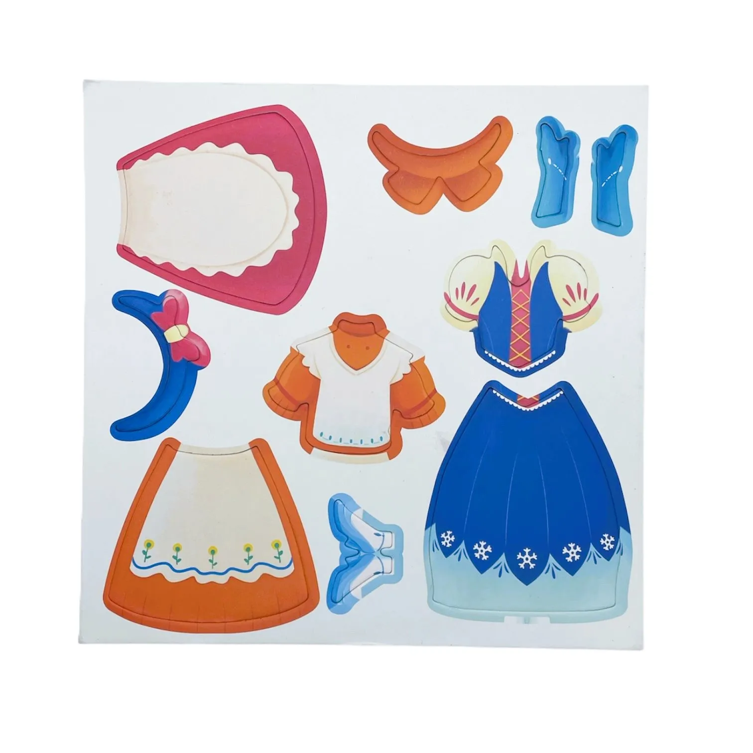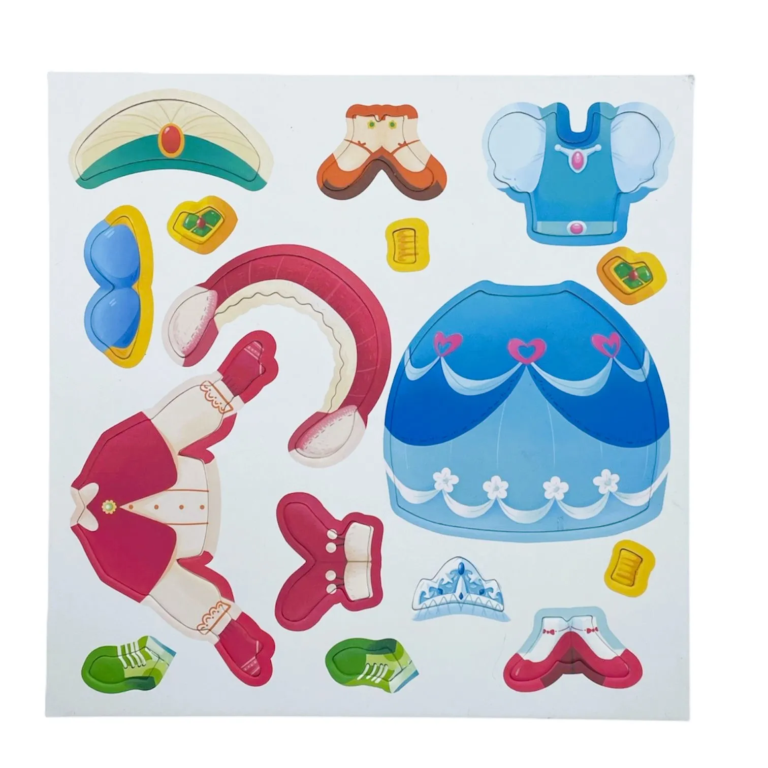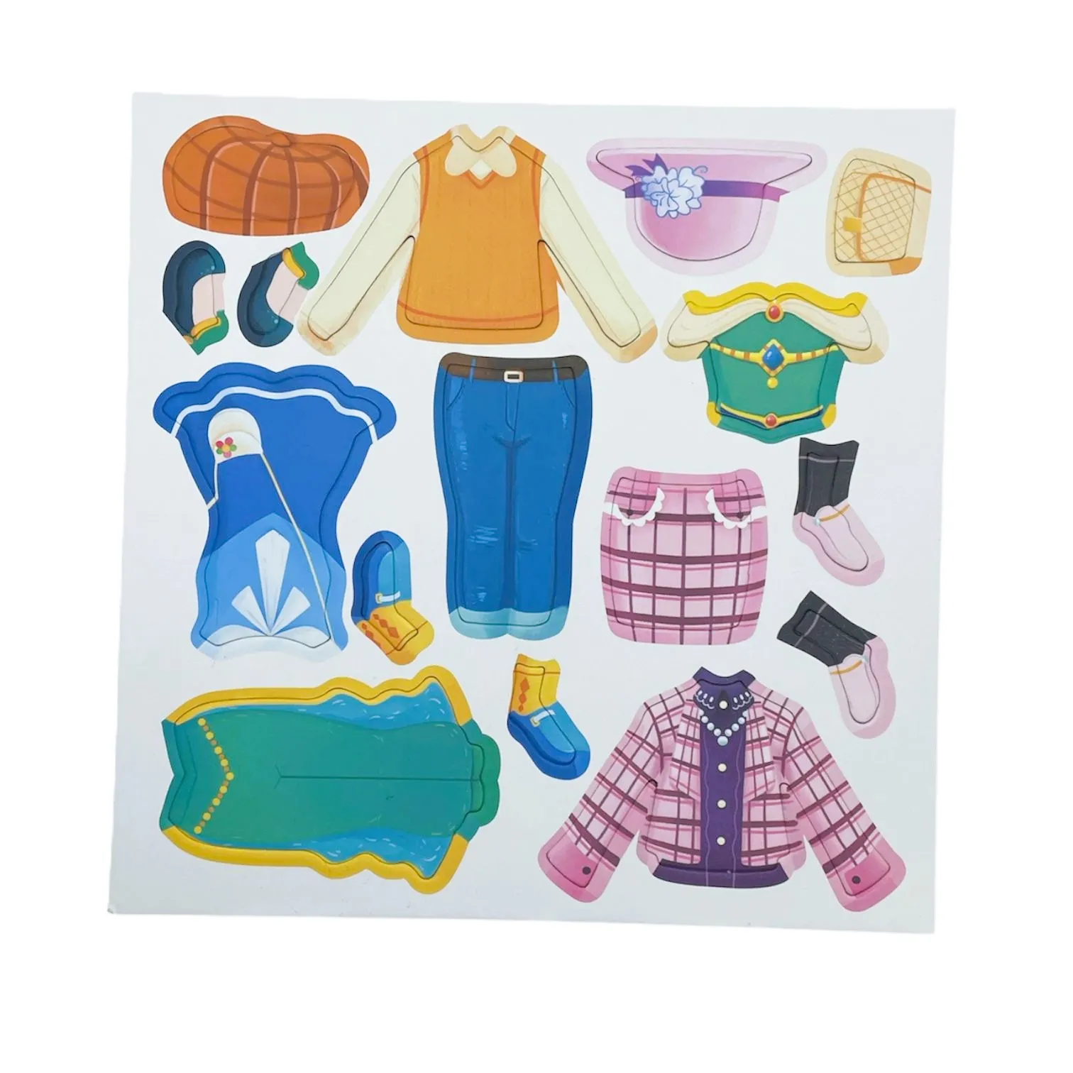 Setul contine o plansa magnetica cu silueta personajului pe care trebuie sa-l imbracati cu piesele vestimentare din cele 3 planse pe care le gasiti in cutie