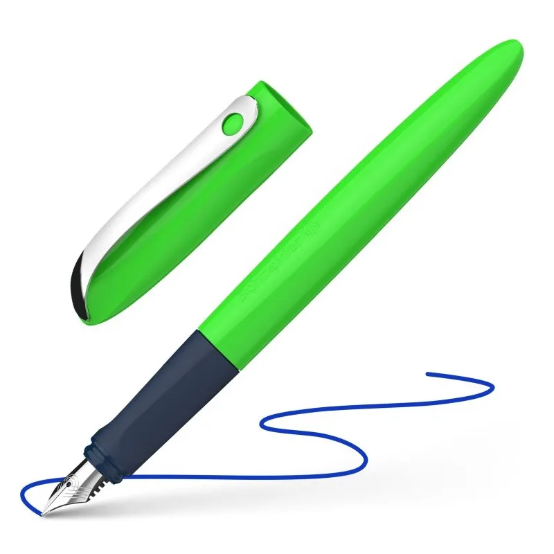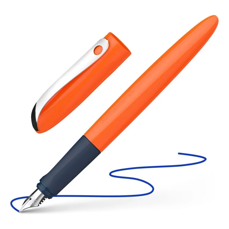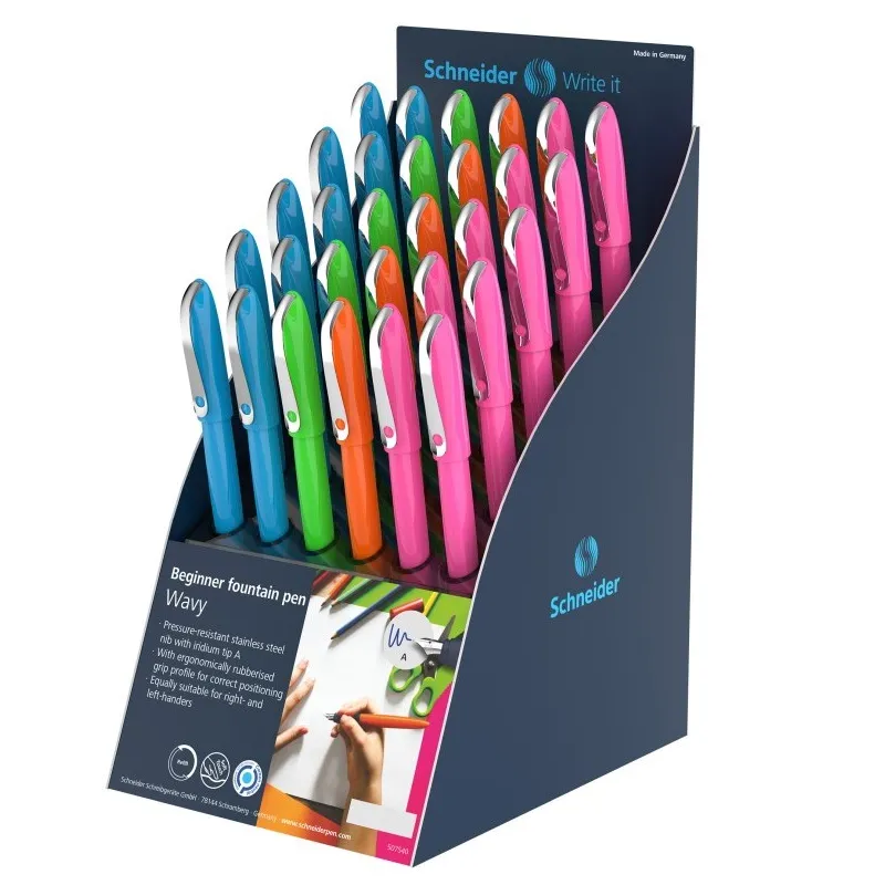 Stiloul Wavy, creat pentru elevi, este disponibil în patru culori strălucitoare — albastru, verde, roz și portocaliu — și este echipat cu peniță din oțel inoxidabil, rezistentă, și cu vârf din iridiu – perfect pentru elevii care încep să scrie cu stiloul. Zona de prindere, cauciucată, ergonomică, potrivită pentru dreptaci și stângaci, induce poziția corectă de scris; în plus, zona generoasă pentru prindere, moale, disipă punctele de presiune.